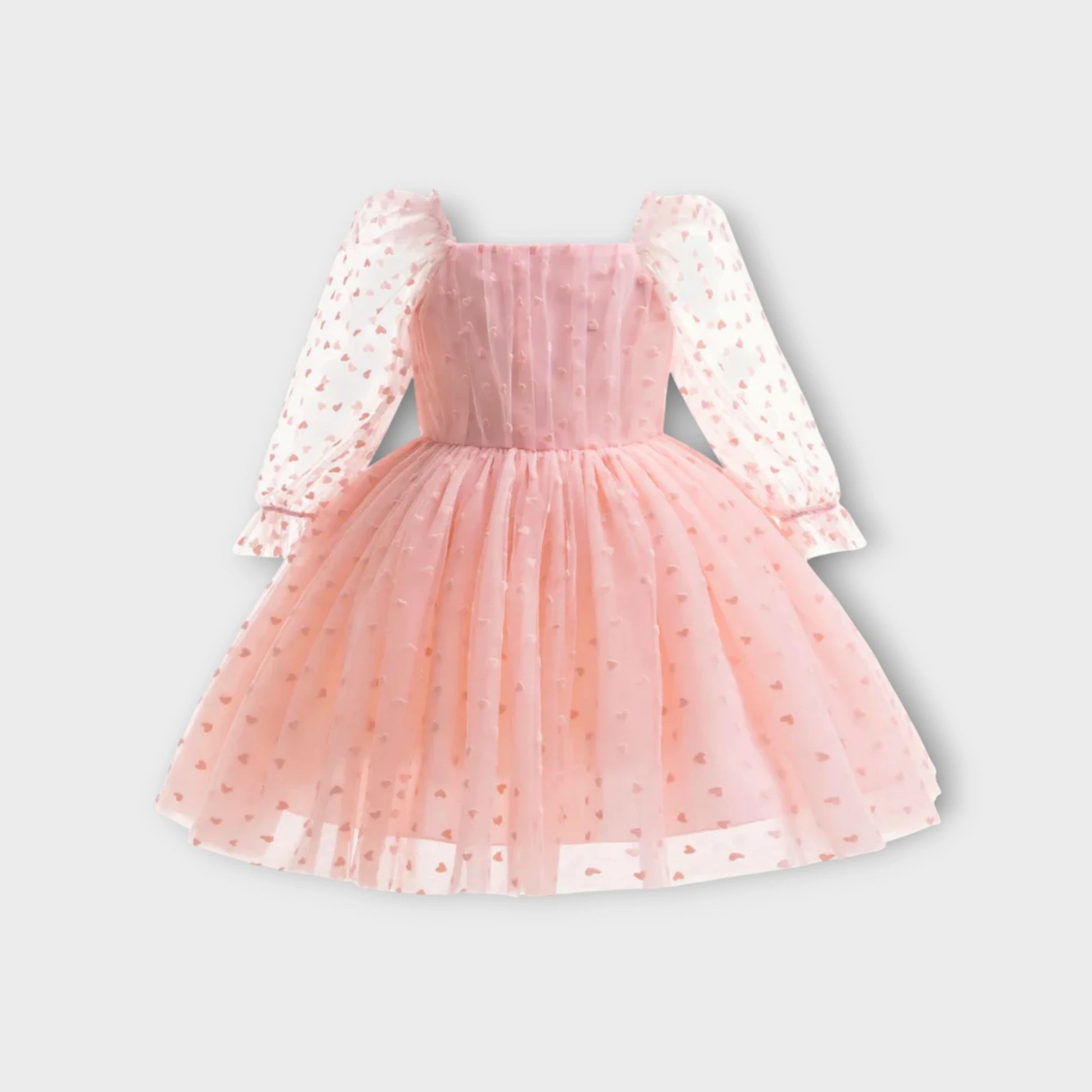The Delilah princess dress features a delicate pattern of small heart shapes, blending classic elegance with a charming detail. Crafted for a refined look, this dress offers a graceful silhouette ideal for special occasions or dress-up moments. Its subtle design enhances the overall sophistication while maintaining a youthful appeal.