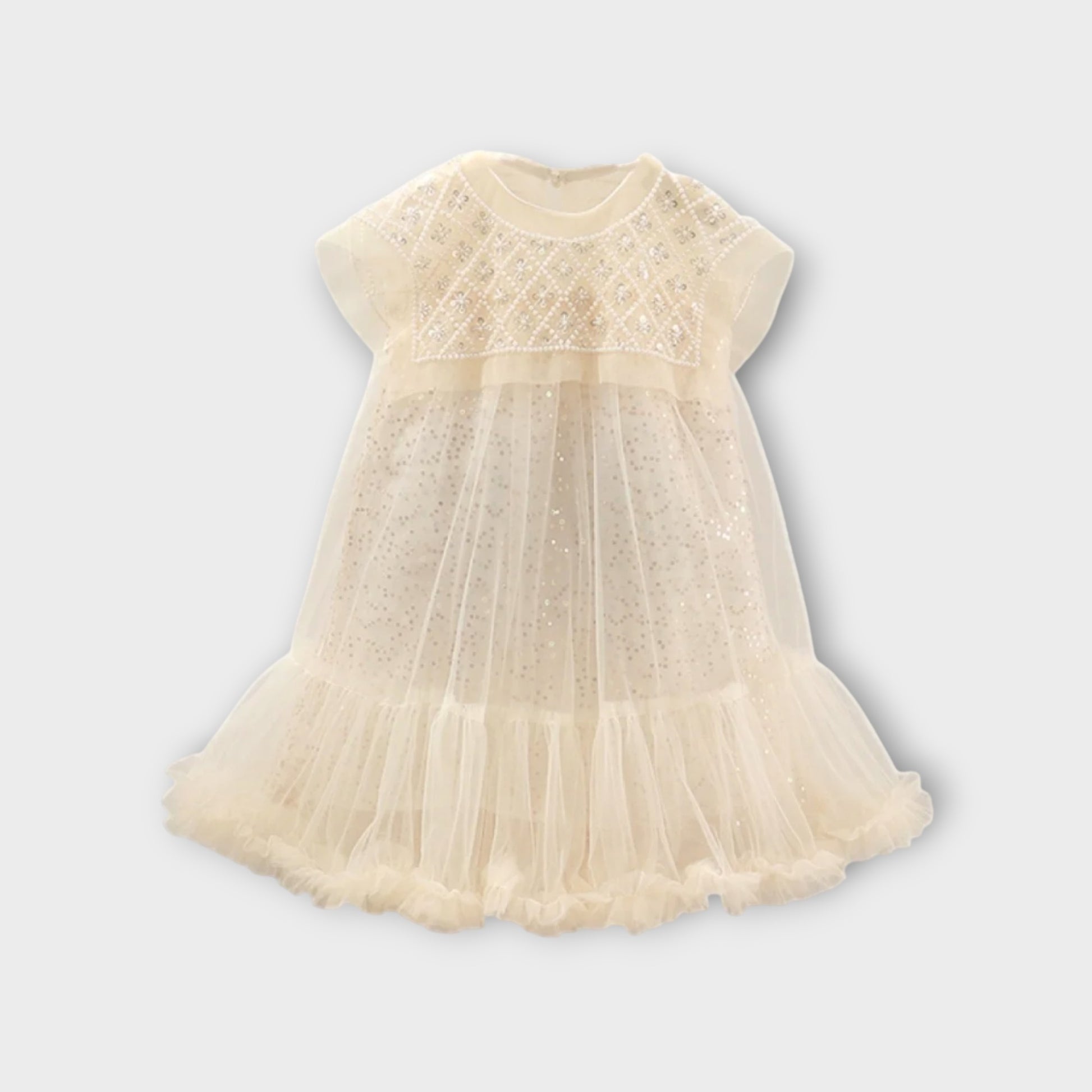 The Ophelia dress features a beautifully beaded collar that adds a touch of elegance and shimmer, perfect for special occasions.